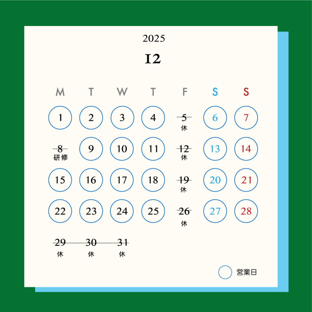 12月は通常より早くご予約が埋まりやすくなっております。すでに土日の空き枠が少なくなってきているため、お早めにご予約いただきますと確実です。