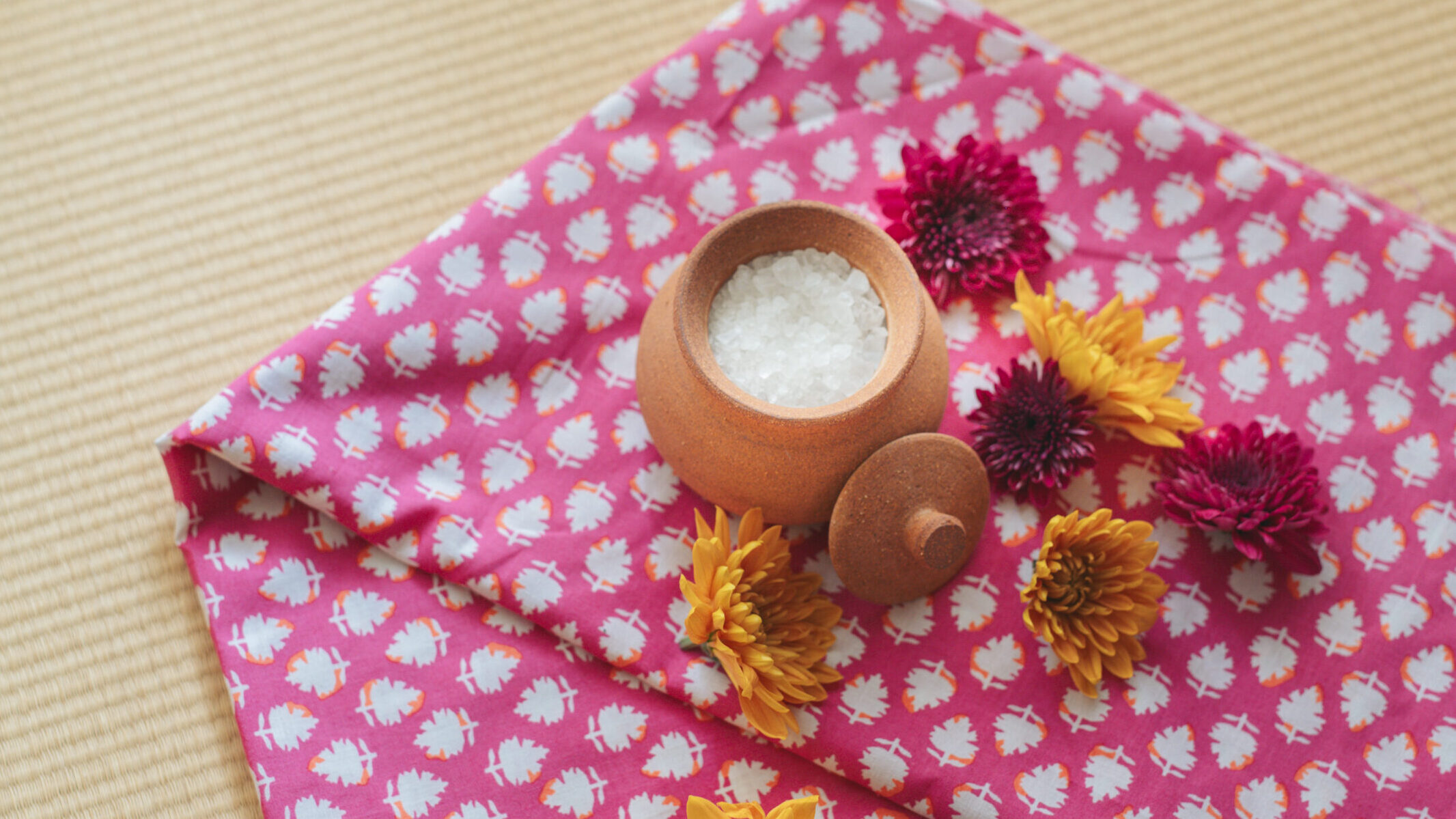 素焼きの壺(ポット)に塩を入れて直火で温めたものとハーブを布で包んでお腹に当てて温めます。子宮ケア、内側からポカポカ温めてスッキリお腹に。